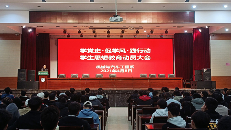 4月8日晚,我院机械与汽车工程系在大会议室举行了“学党史•促学风•践行动”学生思想教育动员大会。大会以党史学习教育为主题,以加强学风建设为主线,分析当前学风建设中存在的问题,号召全体同学以实际行动学知识、强本领、重养成、正言行。机械系全体领导、辅导员及学生参加会议。