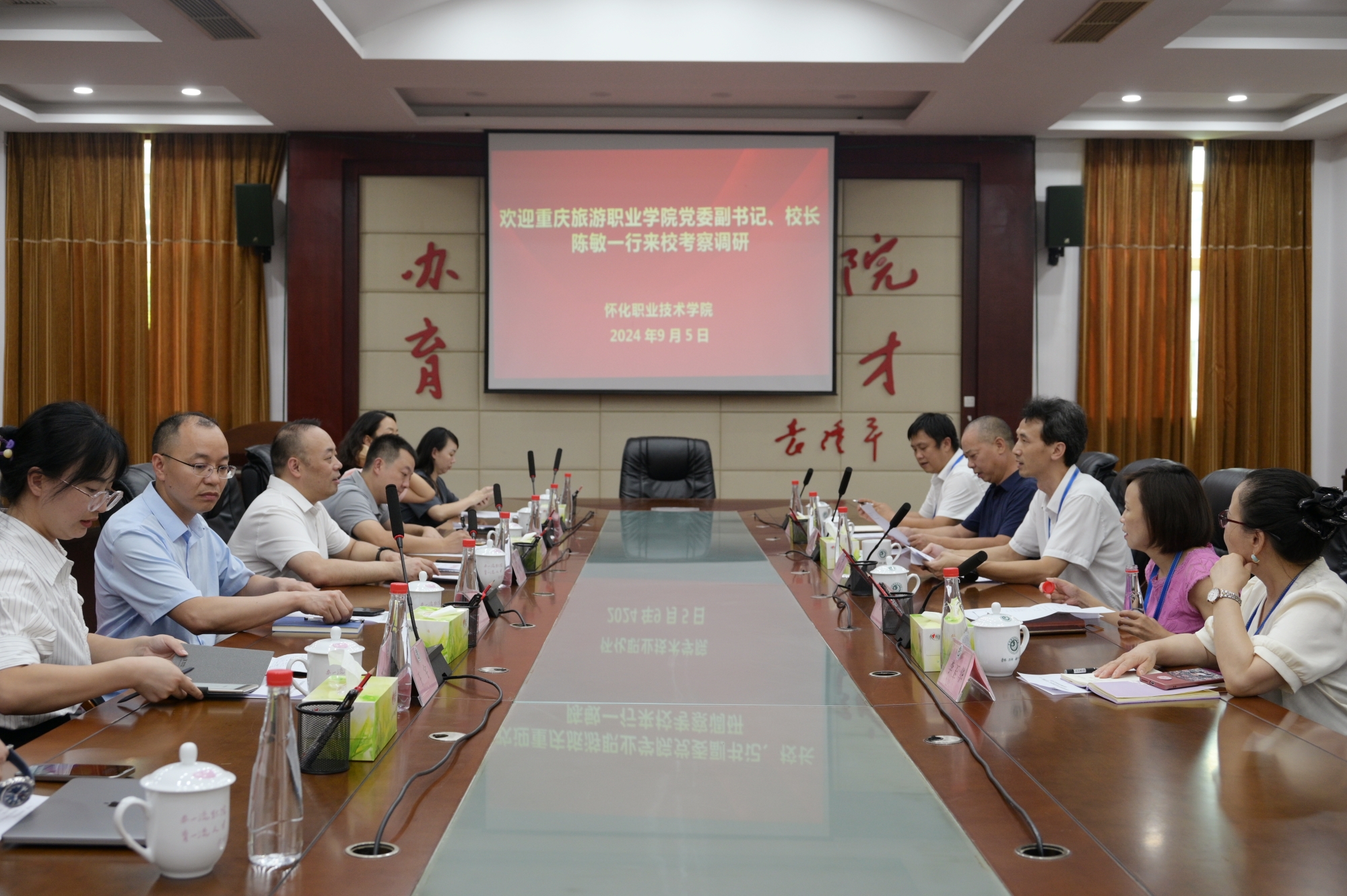 9月5日下午,重庆旅游职业学院党委副书记、院长陈敏一行来我校考察调研。座谈会在学校多功能厅会议室召开,校党委副书记、校长刘学文主持,校领导李亚玲出席,相关部门负责人参加。