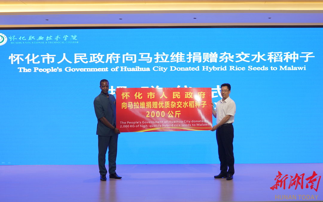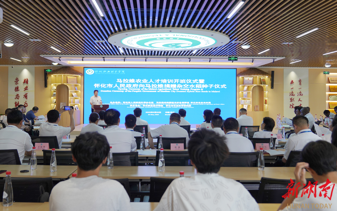 5月20日下午,马拉维共和国农业人才培训班在我校举行开班仪式。开班式上,怀化市人民政府向马拉维共和国捐赠杂交水稻种子2000公斤。