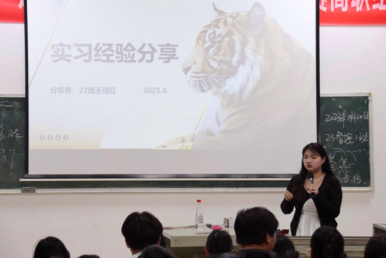 会议邀请2022级优秀学生代表王佳红分享实习经验。王佳红同学结合自身经历,就实习准备、岗位适应、学习要点等方面为学弟学妹提供了宝贵的建议。