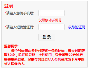 1、登陆线索平台官网(http://haoren.dc.10086.cn/),输入中国移动手机号码及验证码,填写推荐人姓名、事迹类别、好人姓名、好人事迹所发地、事迹简述等信息后,免费完成推荐。