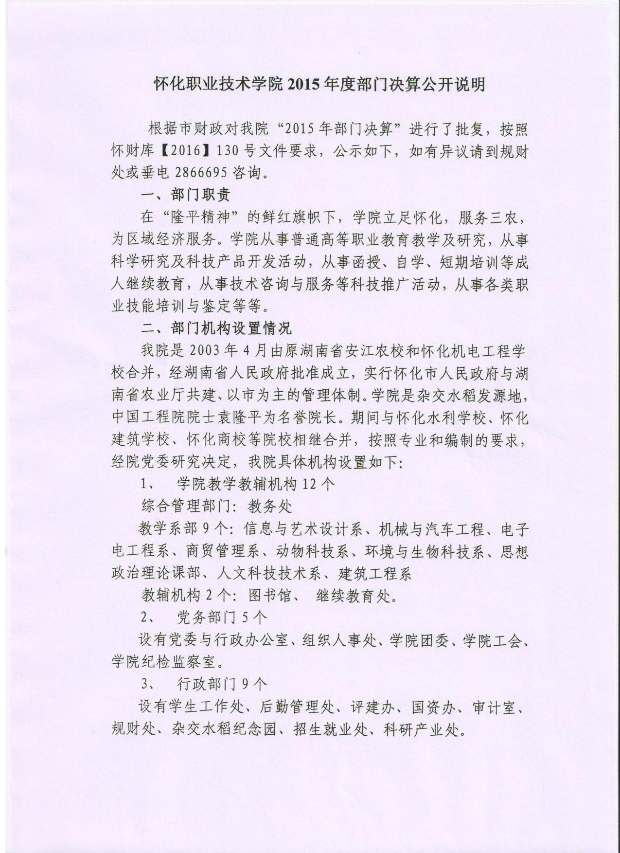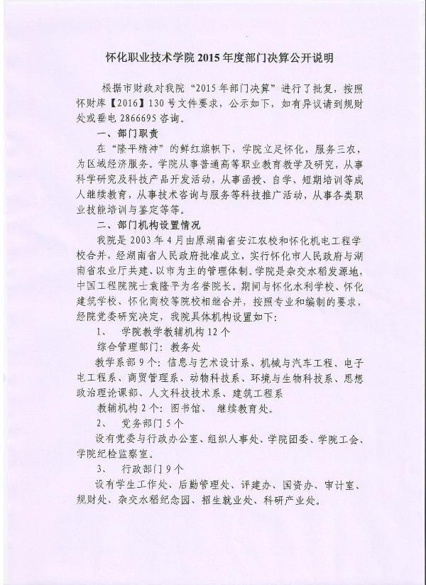 怀化职业技术学院2015年度部门决算公开说明