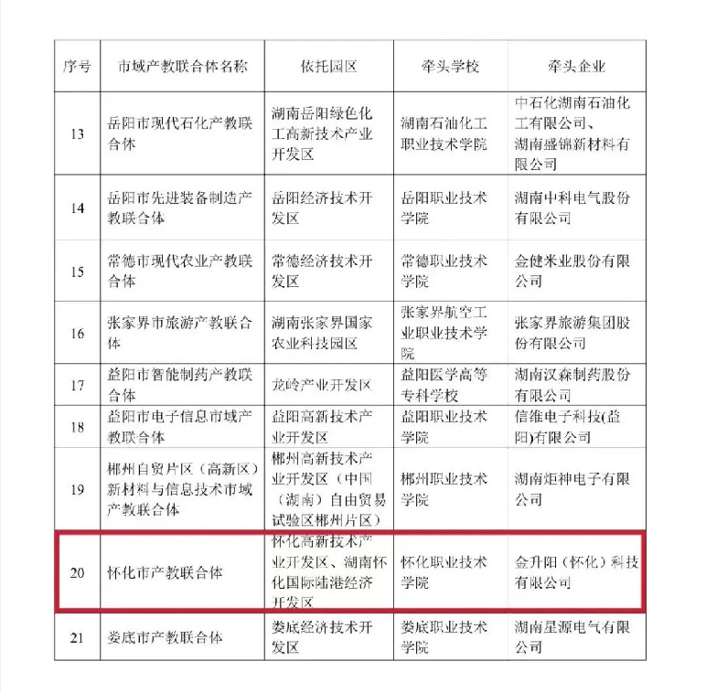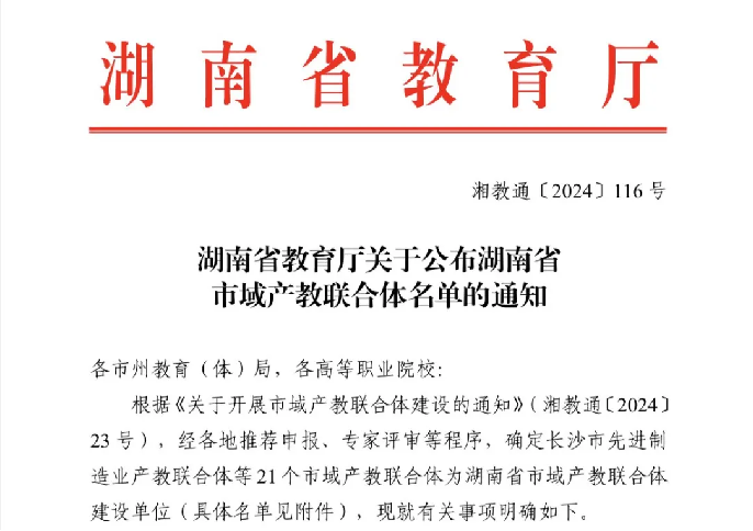 根据《湖南省教育厅关于公布湖南省市域产教联合体名单的通知》湘教通〔2024〕116号,经推荐申报、专家评审等程序,由我校作为牵头学校、依托怀化高新技术产业开发区、湖南怀化国际陆港经济开发区,由金升阳(怀化)科技有限公司作为牵头企业的怀化市产教联合体,被确定为湖南省市域产教联合体建设单位。