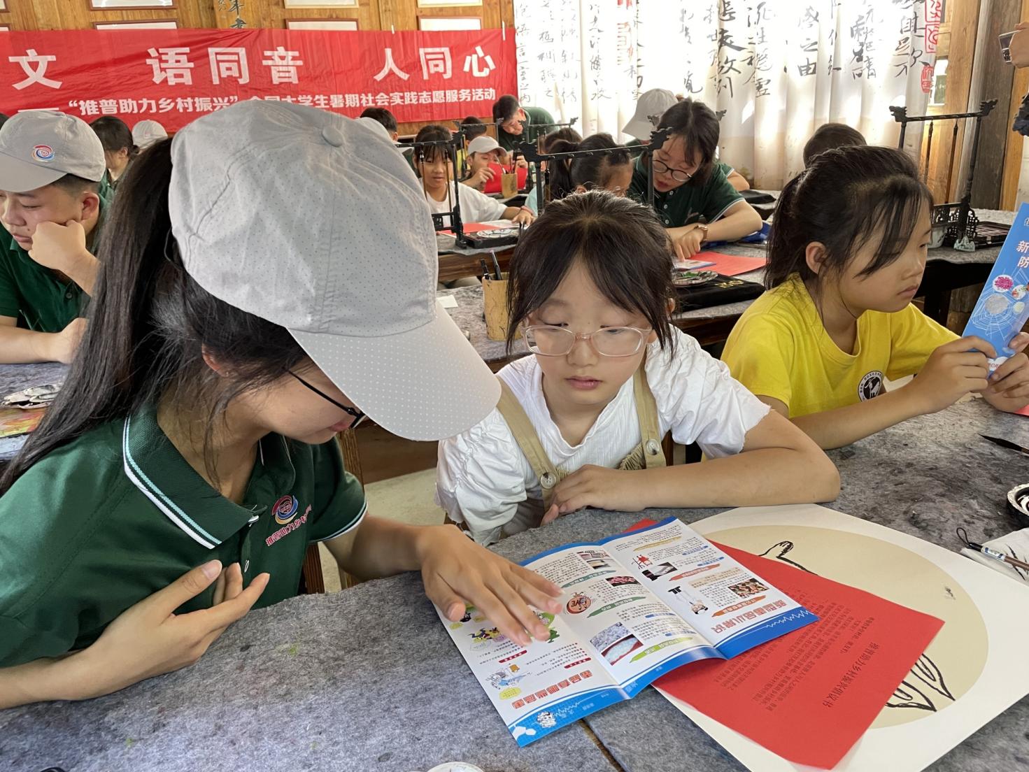 在龙潭镇崇实书院,实践服务团成员围绕“推普知识”“红色教育”“安全教育”等主题,为当地青少年儿童设计一系列生动有趣的普通话教学活动和兴趣拓展课堂,让孩子们在轻松愉快的氛围中感受语言的魅力。