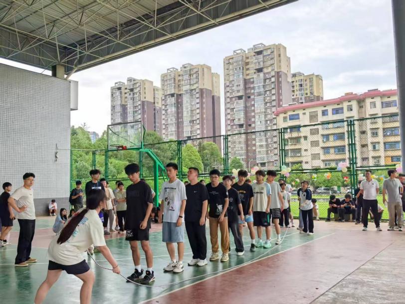 活动当天,充满活力的集体跳绳比赛拉开序幕。摇绳同学有节奏地挥动双臂,跳绳队员们鱼贯而入,轻盈跳跃,现场加油声、欢呼声此起彼伏。随后开展的趣味运动会设置了“海底捞月”“爱心吹气球杯”等项目,师生们自由组队,在轻松愉悦的竞技中释放压力,现场气氛热烈,笑声不断。