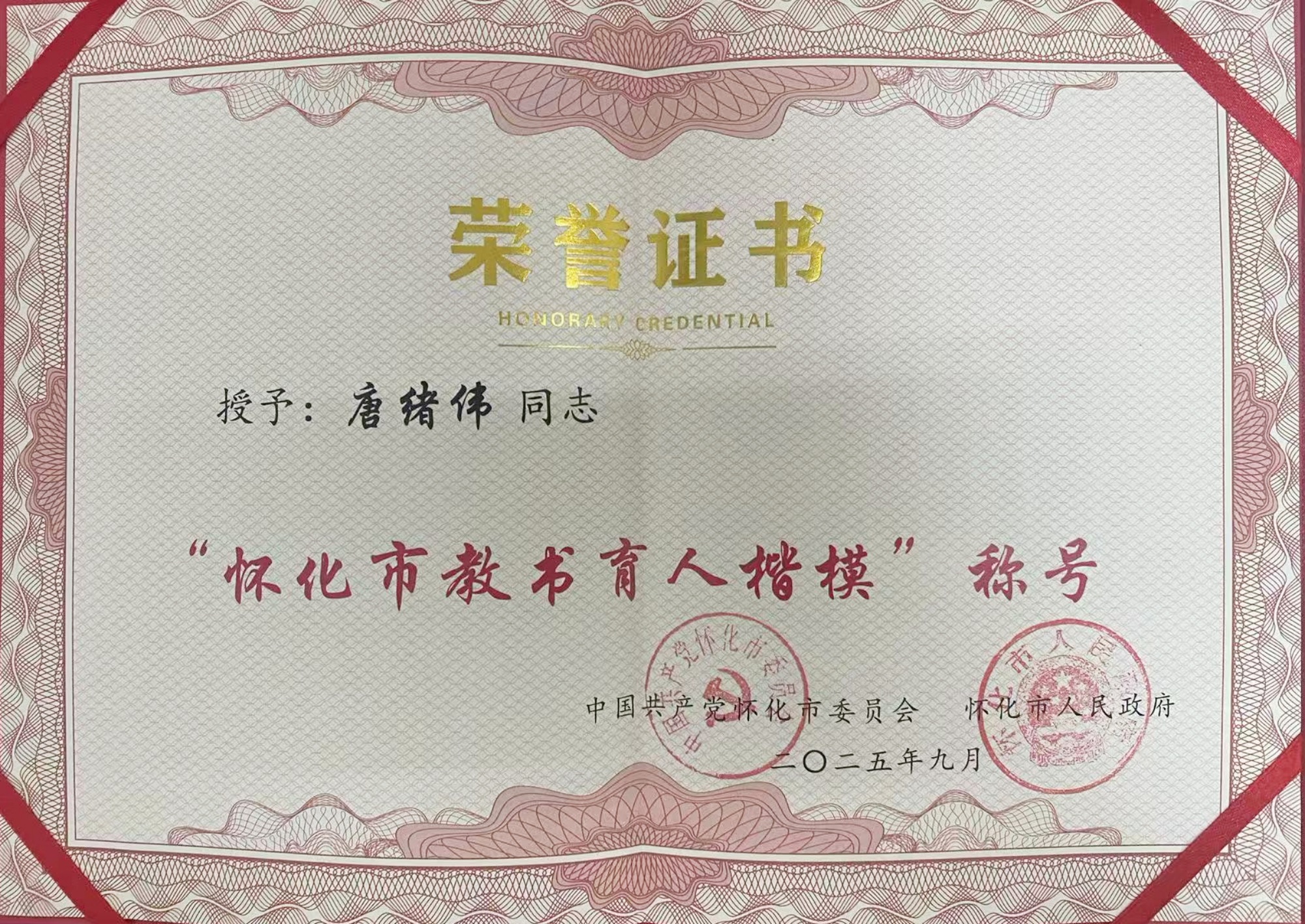 近日,我校教师唐绪伟被怀化市委、市政府授予“怀化市教书育人楷模”称号,并在9月9日召开的全市庆祝第41个教师节表彰大会上作典型发言。
