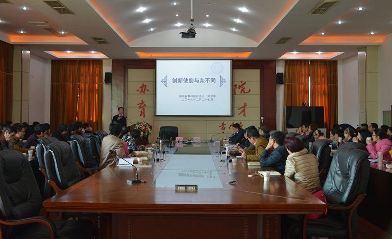 2月27日上午在多功能厅,我院邀请湖南省教科院职成所所长刘显泽给全体院领导和中层干部讲了一堂题为“创新使您与众不同”的讲座。