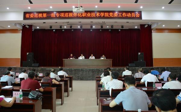省委巡视第一组副组长李建威及巡视组全体成员,怀化职业技术学院班子成员出席会议,各处室、系部负责人及纪检监察、组织人事部门班子成员、近三年正处级以上离退休老同志列席会议。