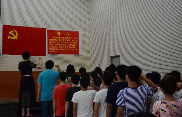 会上新党员在党旗下庄严宣誓,全体老党员一起重温了入党誓词。
