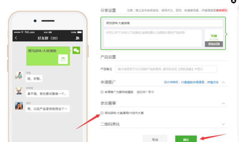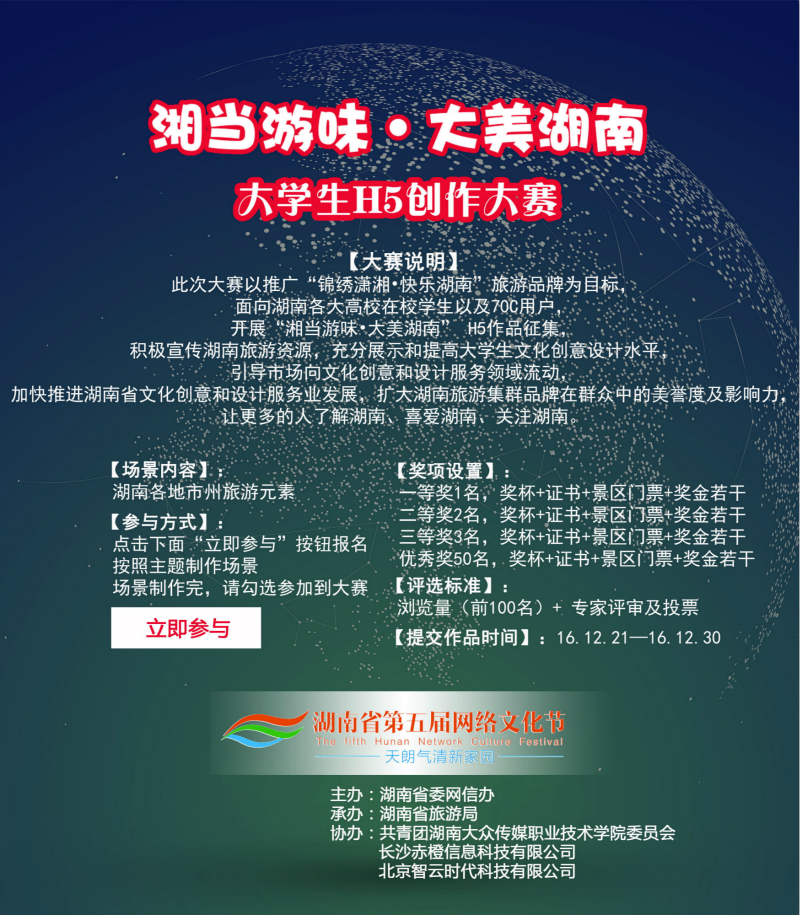 此次大赛以推广“锦绣潇湘·快乐湖南”旅游品牌为目标,面向湖南各大高校在校学生以及70度用户,开展“湘当游味·大美湖南” H5作品征集,积极宣传湖南旅游资源,充分展示和提高大学生文化创意设计水平,引导市场向文化创意和设计服务领域流动,加快推进湖南省文化创意和设计服务业发展,扩大湖南旅游集群品牌在群众中的美誉度及影响力,让更多的人了解湖南、喜爱湖南、关注湖南(湖南省委网信办主办,湖南省旅游局承办,共青团湖南大众传媒职业技术学院委员会、长沙赤橙信息科技有限公司协办、北京智云时代科技有限公司)。