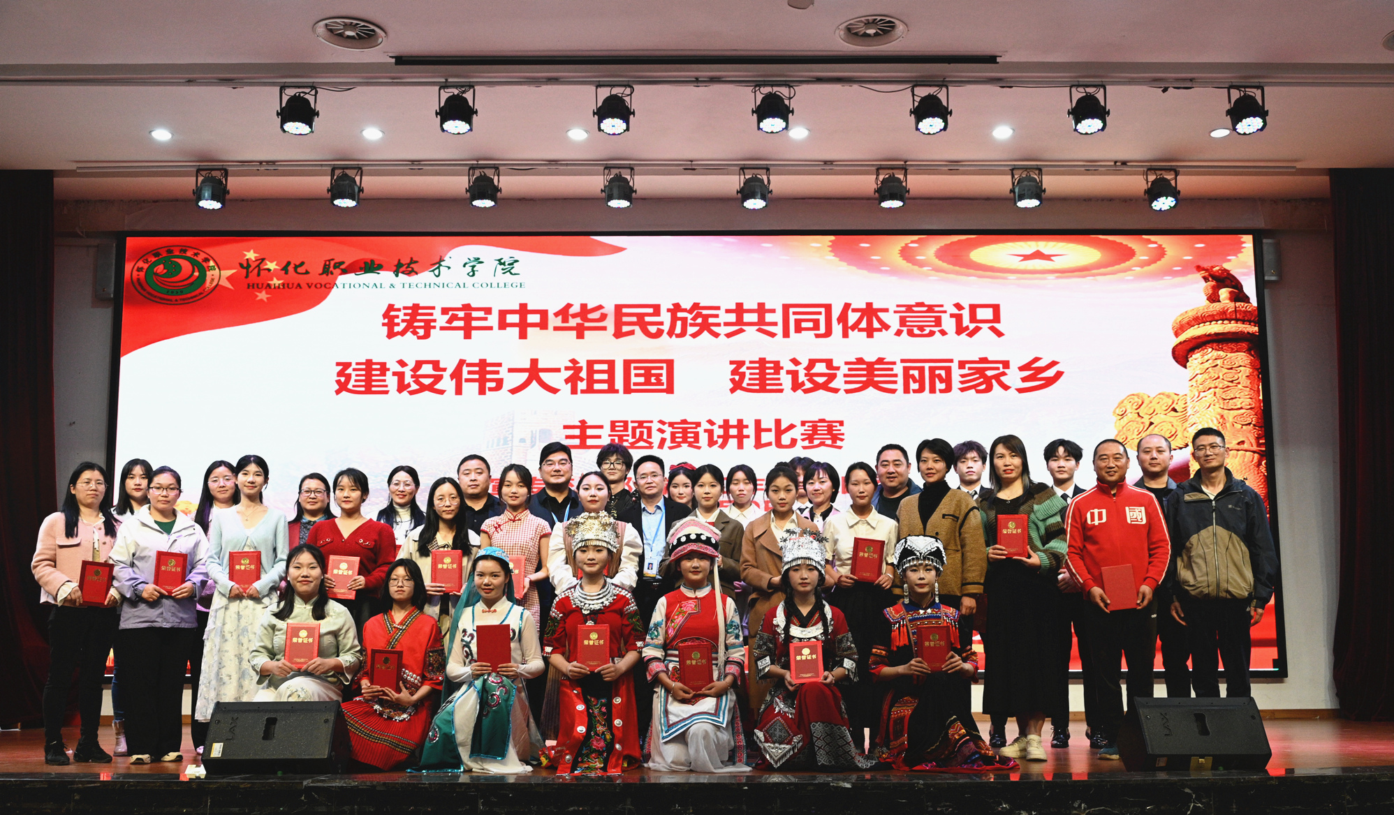 经过初赛,来自5个二级学院、7个民族的17名选手在决赛的舞台上同台竞技。他们用生动的语言和真挚的情感讲述了各民族团结互助,同呼吸、共命运、心连心的感人故事。抒发了对伟大祖国、中华民族、中华文化的热爱之情,表达了永远跟党走的信心和决心,树立了回报家乡、建设现代化新怀化的志向。赛前,学校微信公众号发起“最佳人气选手”网络投票,全校师生参与积极,气氛热烈。经过激烈角逐,动物科技学院的胡文艳、商贸旅游学院的杨小樱两位选手获得演讲比赛的一等奖,信息与设计学院的肖月获得“最佳人气选手”。